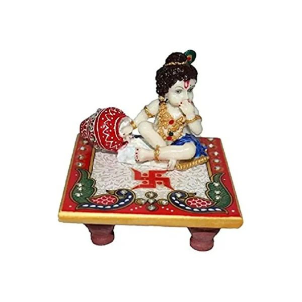 Hand Painted Marble Baby Krishna (Laddu Gopal) Statue with Decorative Chowki