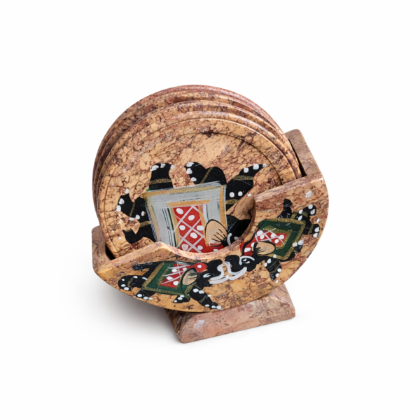 The set comes with a matching coaster holder, making it easy to organize and store the coasters neatly. The natural stone/wood finish combined with the detailed artwork gives it a unique rustic and ethnic look.