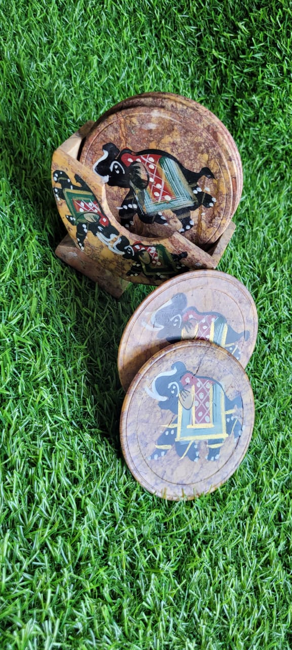 Add a touch of traditional artistry to your home with this handcrafted elephant design coaster set. The coasters feature beautifully painted elephant motifs with vibrant patterns inspired by traditional Indian art.
