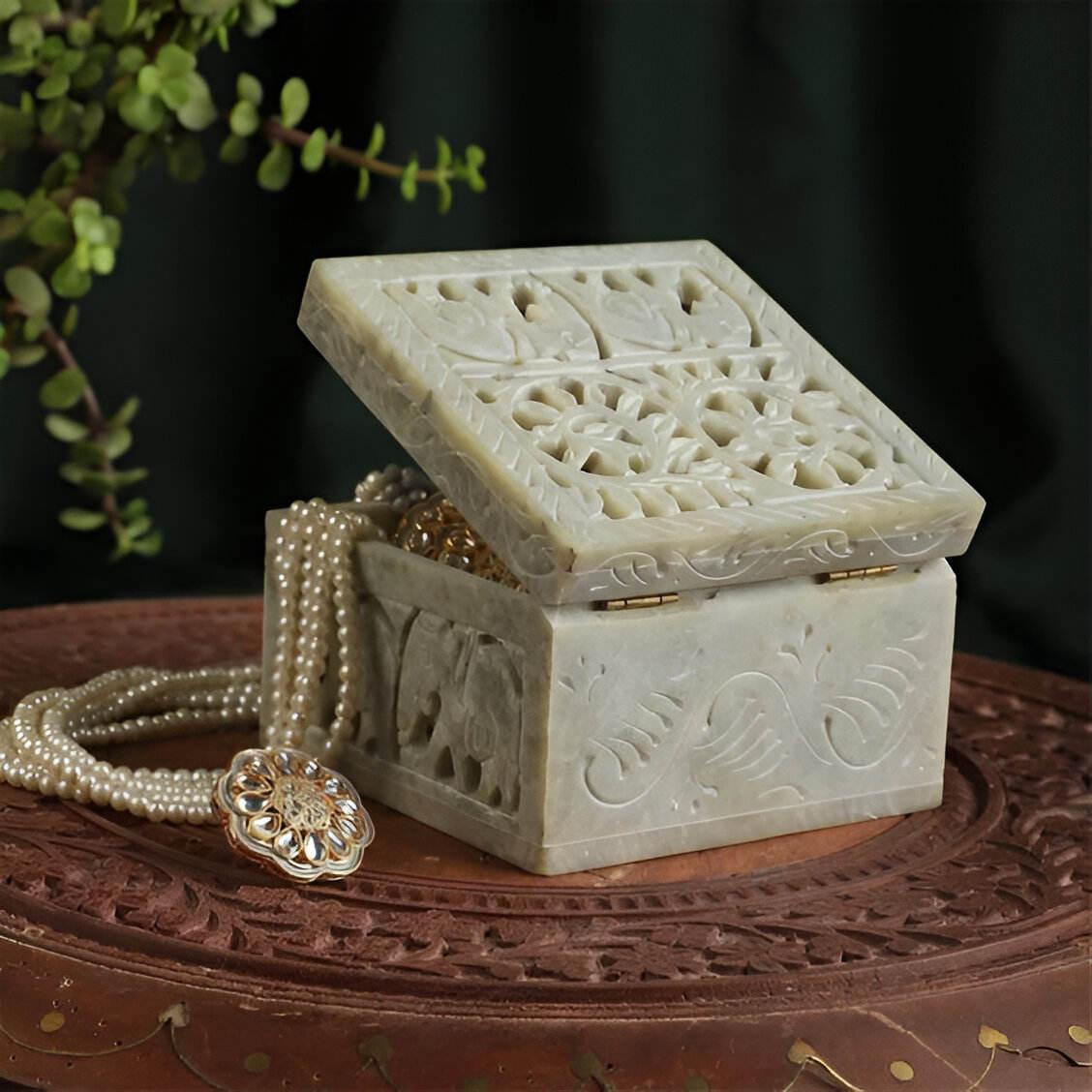Store your valuables in style with this handcrafted green marble jewelry box. Made from premium natural marble, it features a sleek design with a sturdy lid, perfect for keeping your jewelry and small essentials safe and organized.