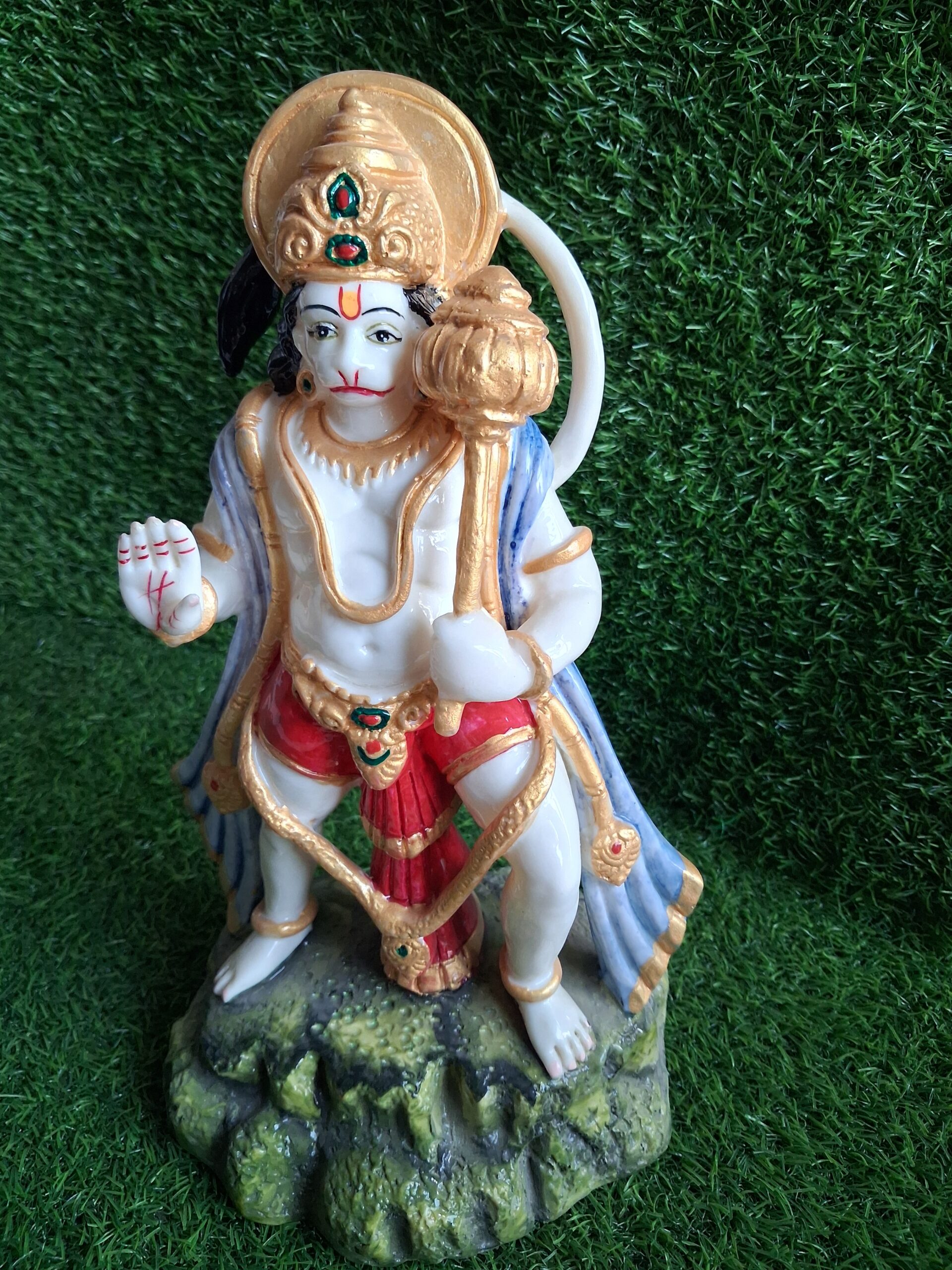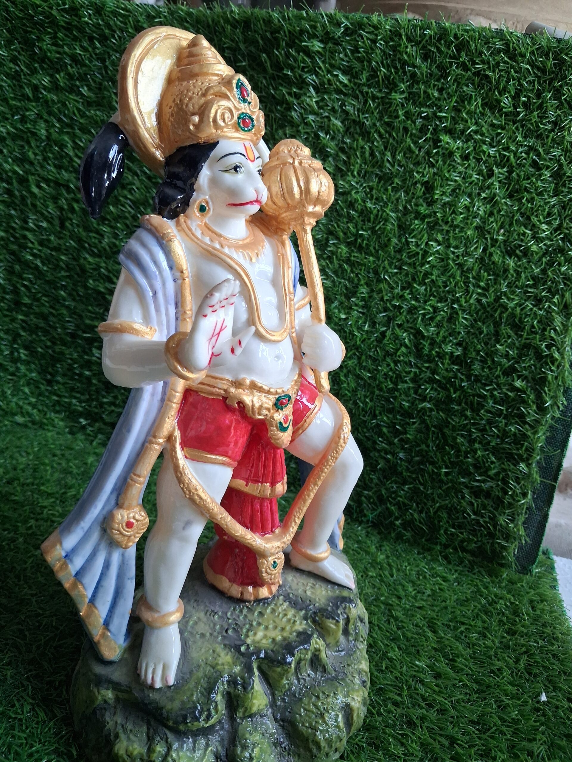 This stunning Lord Hanuman statue is a symbol of strength, devotion, courage, and protection. Carefully handcrafted from high-quality marble, the idol features detailed artwork including a golden crown, sacred ornaments, and Hanuman ji holding his mace (gada).