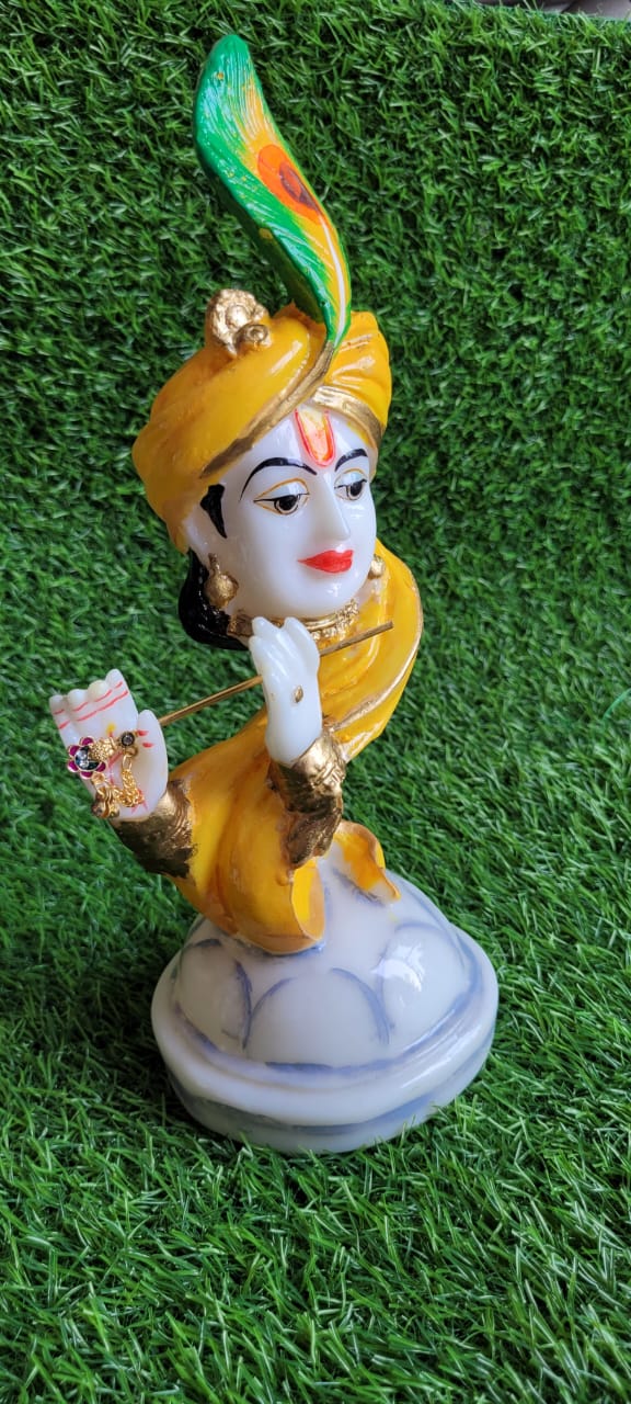 The idol features Krishna wearing a traditional yellow attire and peacock feather crown, standing gracefully on a decorative marble base. The intricate craftsmanship highlights the artistic skills of traditional artisans, making this statue both a spiritual symbol and a decorative masterpiece.