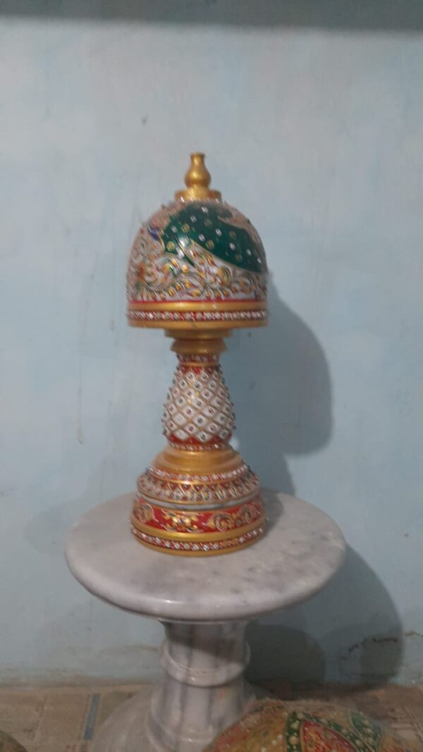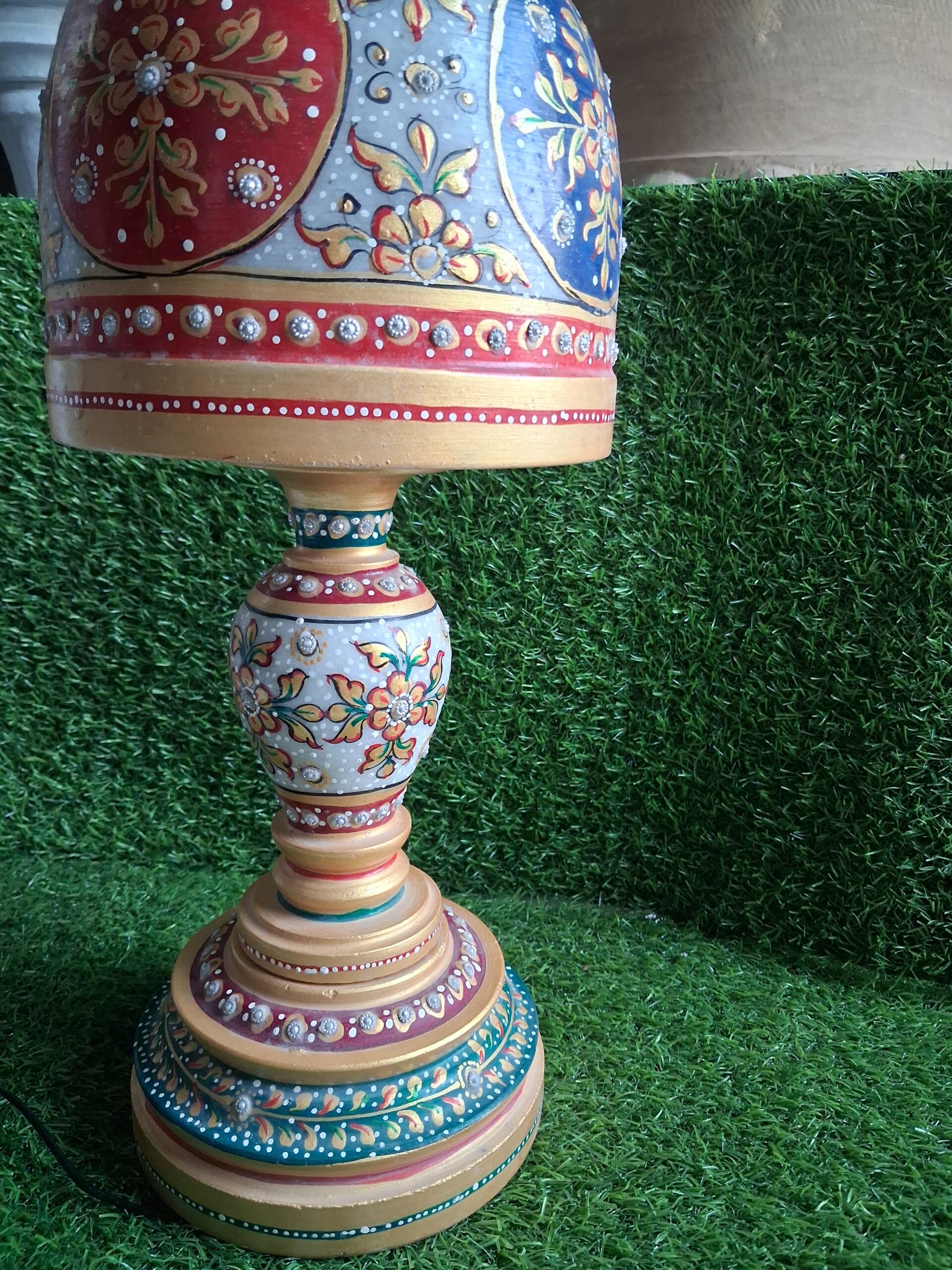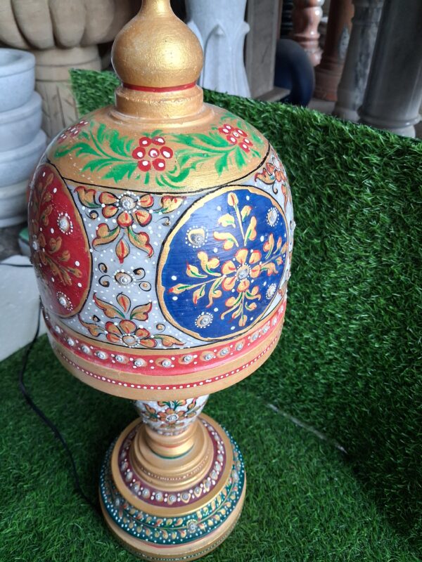 This stunning handcrafted marble decorative table lamp reflects the rich heritage of traditional Indian craftsmanship. Carefully crafted from premium quality marble, the lamp features vibrant hand-painted floral patterns in red, blue, gold, and green tones.