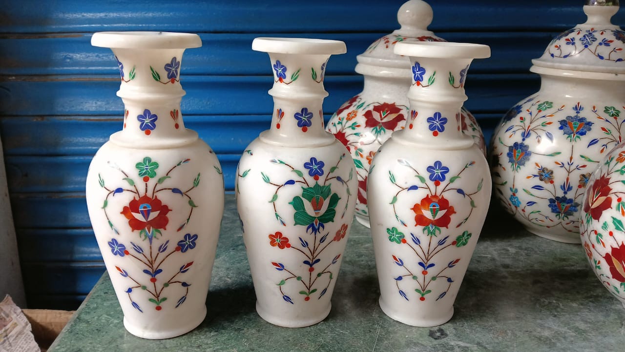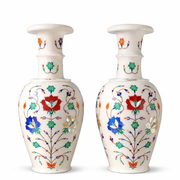 This exquisite handcrafted marble flower vase set is a perfect example of traditional Indian craftsmanship. Made from high-quality white marble, each vase features detailed multicolor floral inlay work created using carefully placed semi-precious stones.