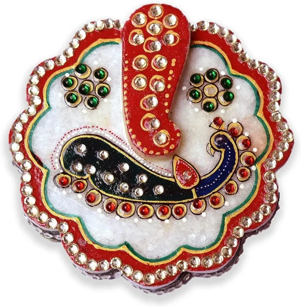 Bring divine elegance to your pooja space with this handcrafted marble Ganesha kumkum box. Made from high-quality natural marble, the box is beautifully decorated with traditional meenakari painting and sparkling stone work.
