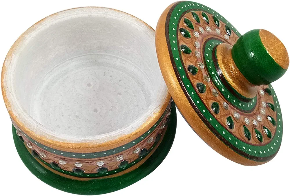Add a traditional and elegant touch to your pooja space with this Handcrafted Marble Kumkum Box. Made from premium quality natural marble, this decorative container features beautiful hand-painted artwork with green and golden detailing along with decorative stone embellishments.