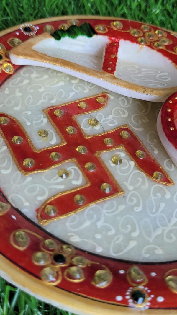 Add a touch of tradition and elegance to your spiritual rituals with this handcrafted marble pooja thali. Carefully crafted from high-quality natural marble, the thali features intricate meenakari artwork and decorative stone inlay patterns that reflect traditional Indian craftsmanship.