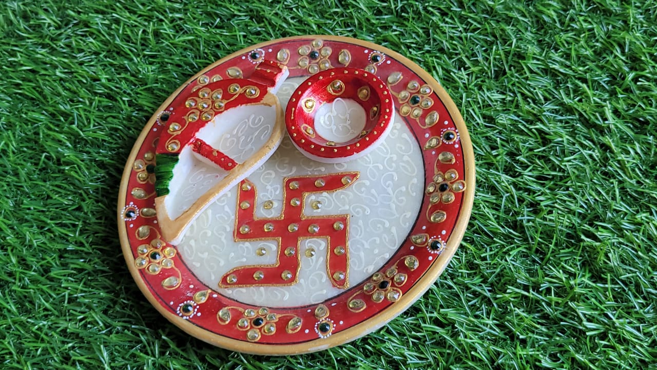The thali includes two diya holders for lighting oil lamps during pooja rituals and a beautifully designed swastik symbol at the center, representing prosperity, positivity, and good fortune.