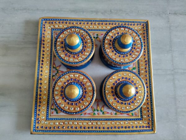 Handcrafted Marble Puja Chowki Set with 4 Decorative Containers