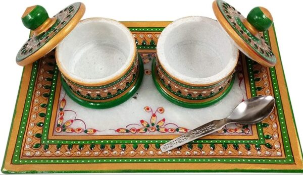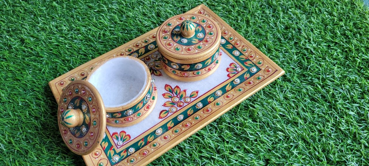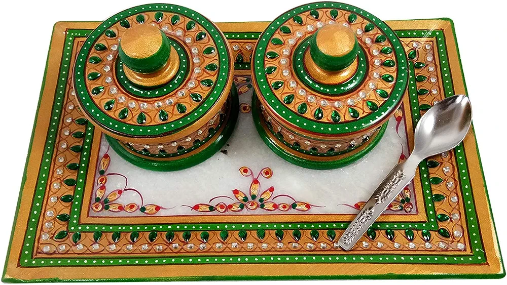 The set includes two decorative containers with lids and a spoon, making it ideal for storing kumkum, roli, chawal, haldi, or other pooja essentials. The intricate craftsmanship and vibrant design make this thali perfect for daily pooja, festive rituals, weddings, and religious ceremonies.