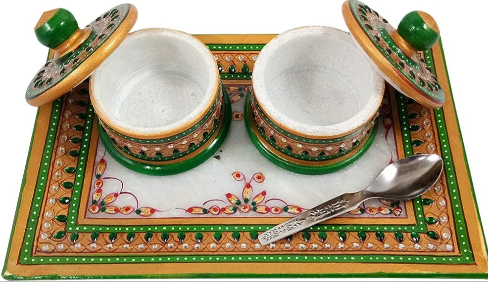 Add a traditional and elegant touch to your pooja rituals with this Handcrafted Marble Puja Thali Set. Made from premium quality natural marble, this thali features beautiful hand-painted artwork with green and golden detailing and decorative stone embellishments.
