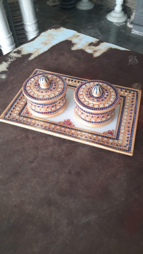 Handcrafted Marble Puja Thali Set with Decorative Containers and Spoon