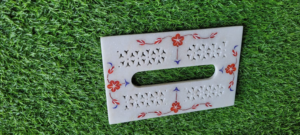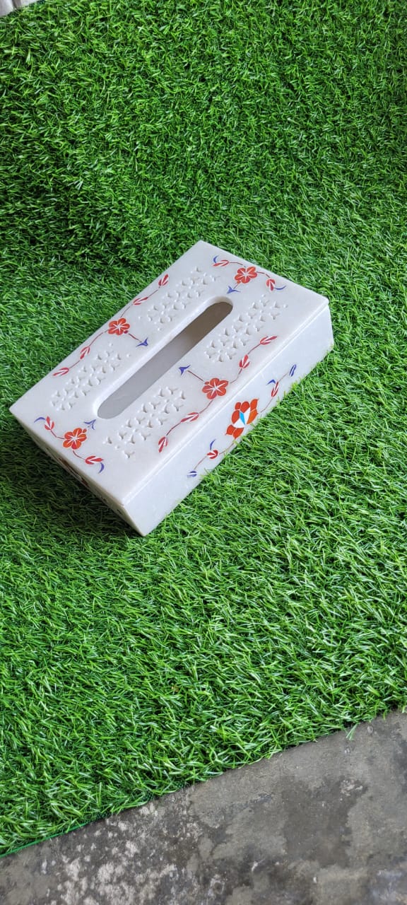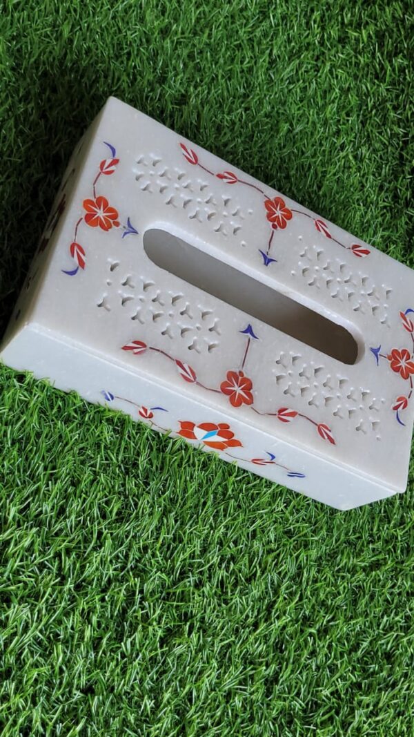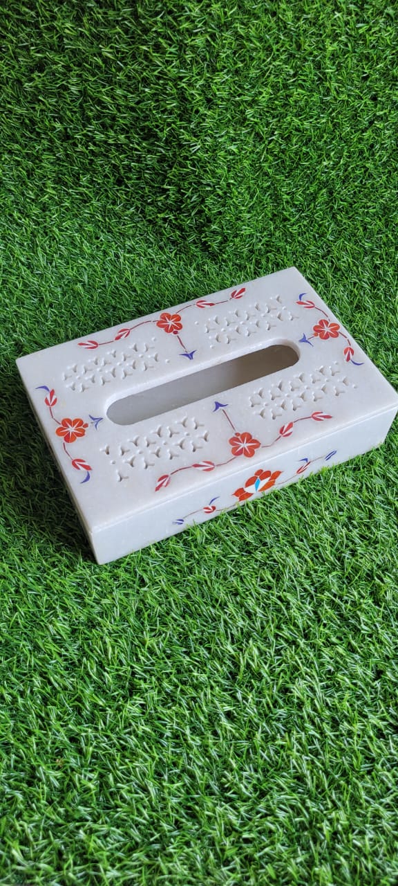 Add a touch of elegance to your home décor with this handcrafted marble tissue box holder. Made from premium quality marble, this decorative tissue box features intricate stone inlay patterns in vibrant red, green, and gold tones.