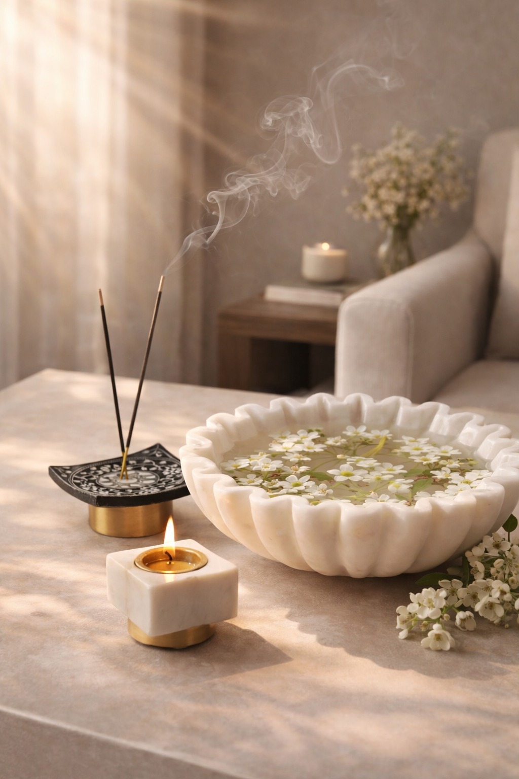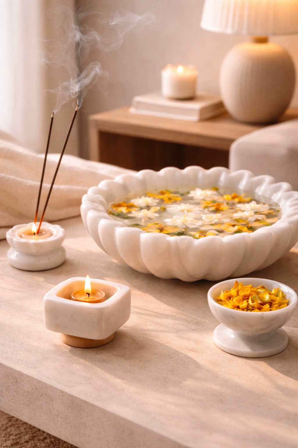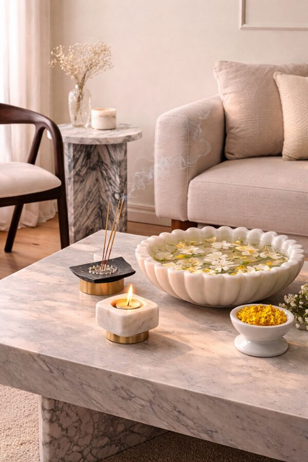 Handcrafted Marble Urli Bowl Set with Diya & Incense Holder | Decorative Home & Pooja Set