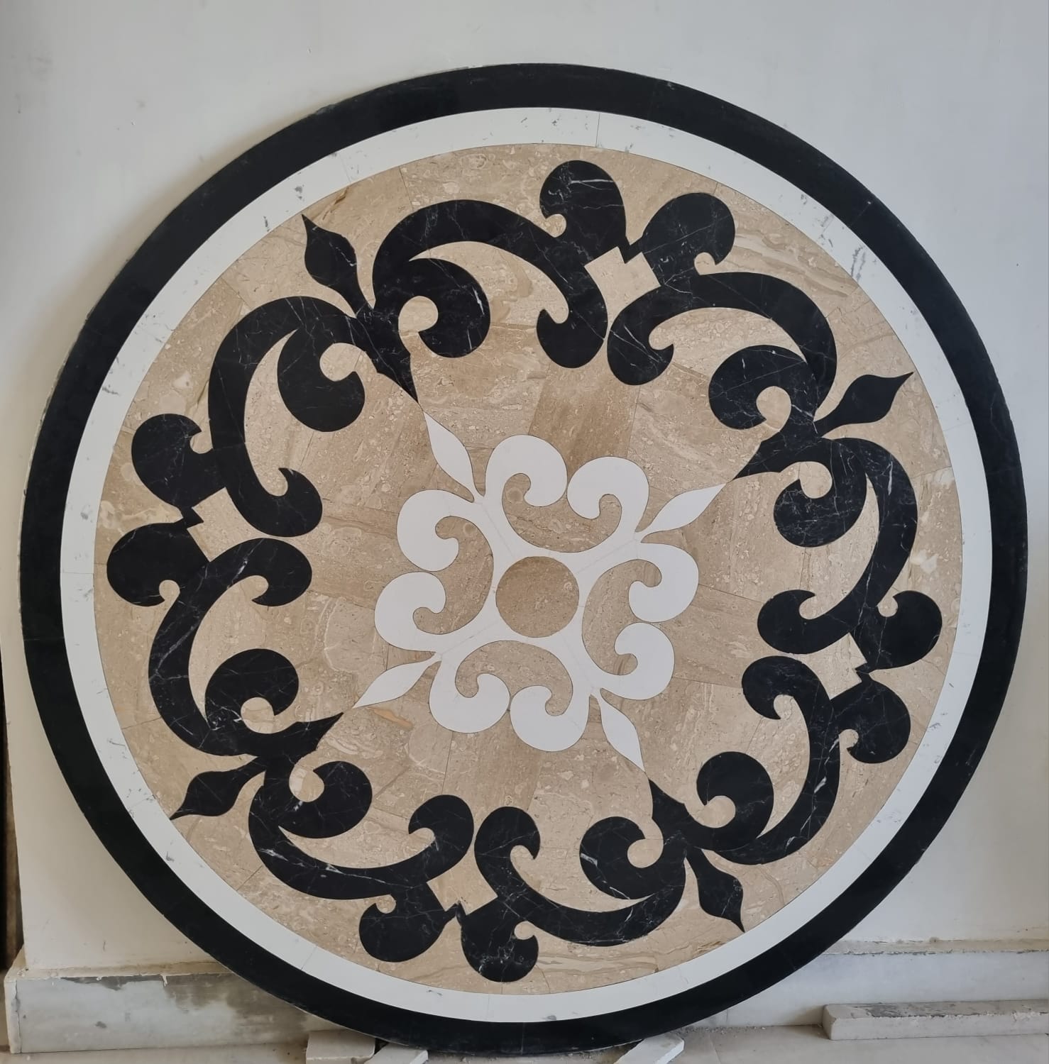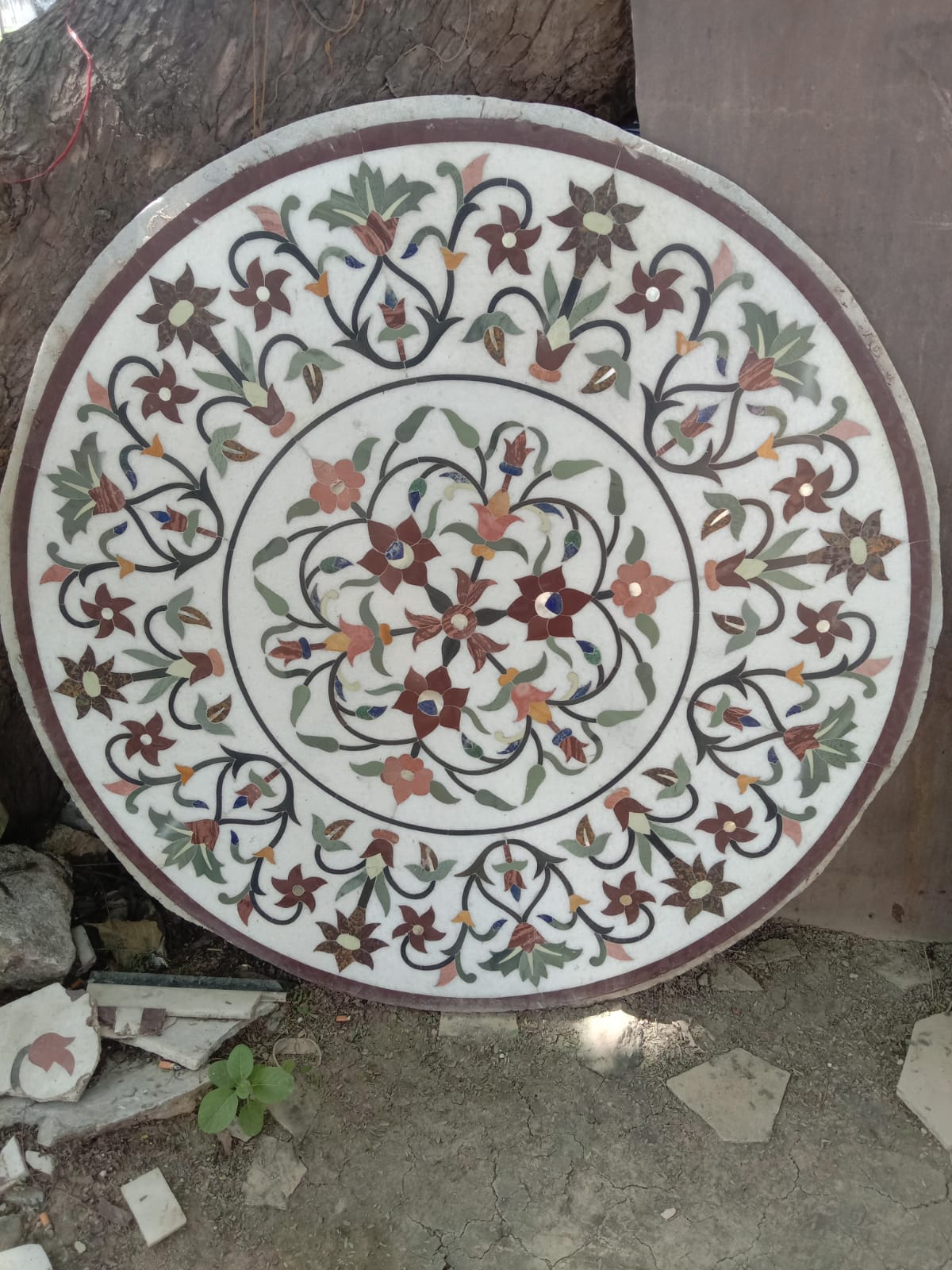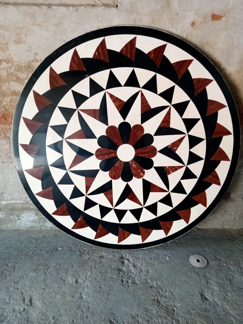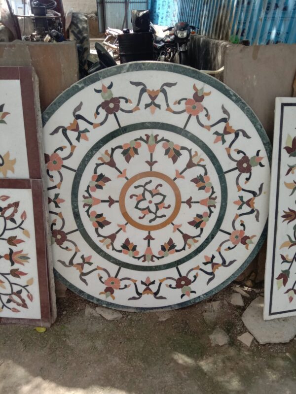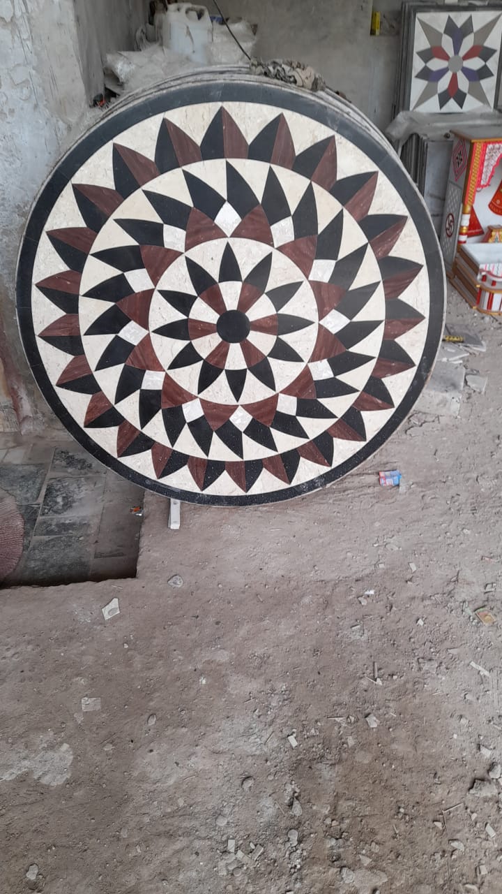 Add elegance and artistic craftsmanship to your home with this handcrafted marble inlay table top. The round surface features a mesmerizing geometric floral pattern created using traditional stone inlay techniques.