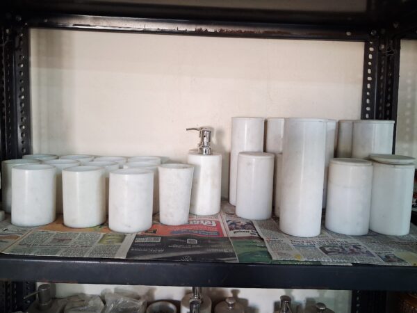This premium white marble bathroom accessories set is beautifully handcrafted from high-quality natural marble. The set includes soap dispensers with metal pumps and decorative marble holders, designed to enhance the elegance of your bathroom or kitchen.