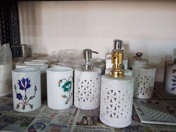 The accessories feature intricate marble carving patterns and colorful floral inlay designs, giving them a sophisticated and artistic appearance. The durable marble construction ensures long-lasting quality while the polished finish provides a luxurious look.