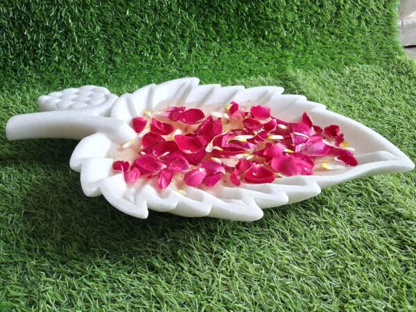 The bowl is ideal for pooja flower petals, potpourri, dry fruits, keys, jewelry, or decorative display. Its smooth polished marble surface and elegant white color make it a perfect décor piece for living rooms, coffee tables, temples, or office desks.