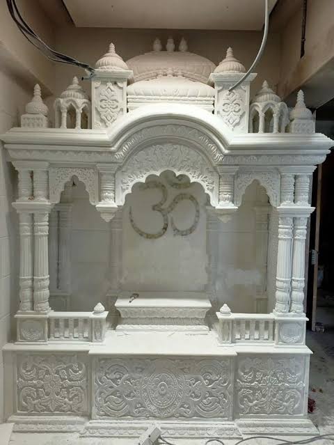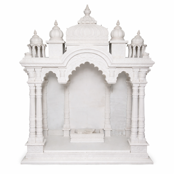 Create a divine and peaceful atmosphere in your home with this beautiful handcrafted white marble temple (pooja mandir). Designed with traditional Indian temple architecture, this mandir features intricately carved pillars, decorative domes, arches, and detailed floral carvings.