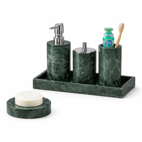 Upgrade your bathroom décor with this elegant green marble bathroom accessories set. Crafted from premium natural marble, this set includes a soap dispenser, toothbrush holder, storage jar, soap dish, and tray—combining functionality with a luxurious look.