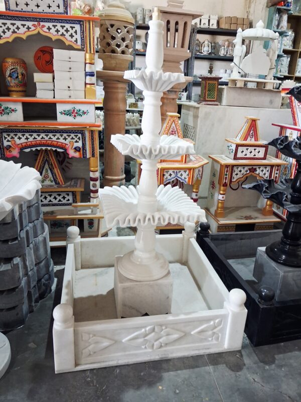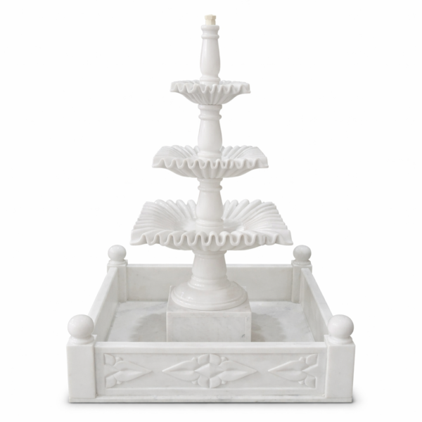 Bring timeless elegance and peaceful ambiance to your space with this handcrafted white marble three-tier fountain. Designed with smooth flowing curves and intricately carved bowl layers, this fountain creates a soothing cascading water effect that enhances both indoor and outdoor environments.
