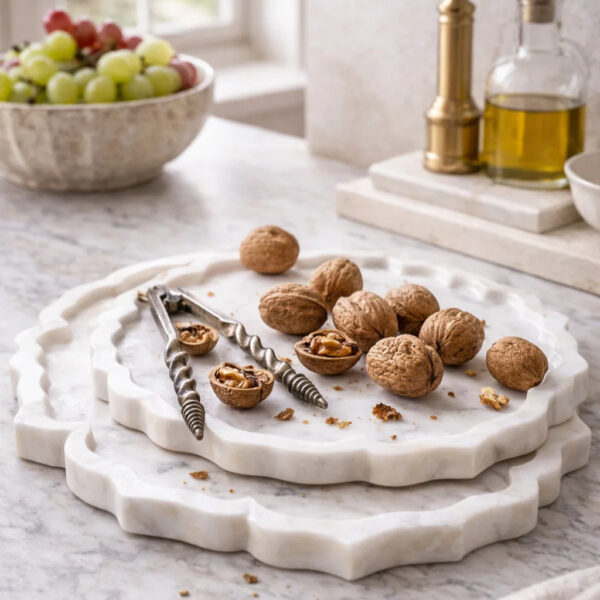 These marble plates are not only functional but also act as stylish table décor pieces, making them ideal for modern kitchens and dining setups.